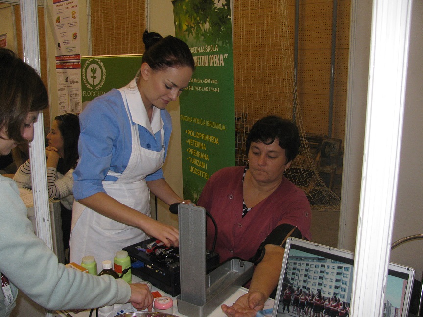 Naš cilj bio je predstaviti svoje redovne programe te programe obrazovanja odraslih. Posjetiteljima smo izložili kratki filmić u kojem smo prikazali opremljenost škole, kao i zajedništvo, odgovornost i rad naših učenika pod budnim okom naših profesora i ostalih djelatnika škole. Pojavili smo se u radnim uniformama te smo posjetiteljima nudili mogućnost mjerenja krvnog tlaka. Naš pult posjetilo je mnogo odraslih ljudi, kao i učenika. Neki od njih bili su zainteresirani za program obrazovanja odraslih, neki za prekvalifikaciju, a bilo je i roditelja osmaša koji su se raspitivali o mogućnostima škole i uvjetima koje moraju ispuniti njihova djeca da bi postali učenicima naše škole.