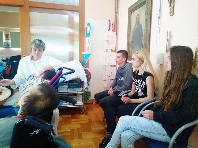 kako izgleda primjena TENS-a i pilates lopte u fizioterapiji djece s cerebralnom paralizom, isprobali su relax kutak s krevetom za opuštanje mišića, pogledali smo kupaonu prilagođenu ljudima s paralizom, te nam je voditeljica Katarina Hoblaj pokazala sve prateće sadržaje i posebno vozilo za djecu. Čuli smo da brinu o četrnaestoro djece s raznim oštećenjima koji dio dana provode u dnevnom boravku gdje dobivaju mnogo pažnje djelatnika i volontera, kao i odličnu njegu i vježbe. Mnogo je vanjskih suradnika: logoped, vjeročiteljica, radni terapeut, fizioterapeut, ortodont itd. koji pomažu u radu za dobrobit djece. Ugodan, ali i duboko dirljiv posjet završili smo s radnom terapeutkinjom i malim Gabrijelom koji marljivo vježbaju uz dobar napredak. Svakako mjesto na koje ćemo se često vraćati!