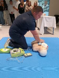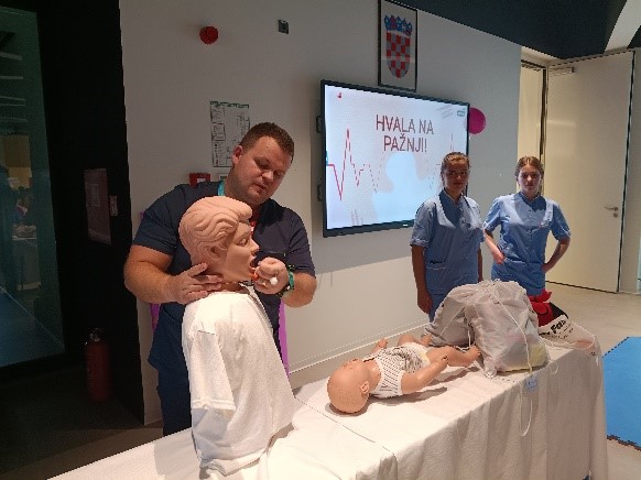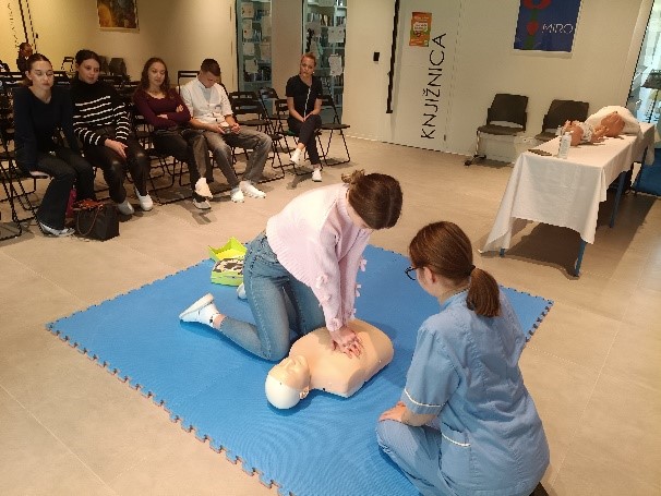 Nakon učeničkih predavanja nastavila se radionica Osnove oživljavanja – BLS i upotreba AVD-a, u kojoj su učenici kroz demonstraciju i praktičan rad uvježbavali osnovne postupke oživljavanja i rada s automatskim vanjskim defibrilatorom.