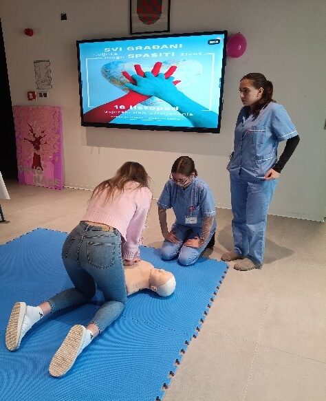 Povodom Svjetskog dana oživljavanja 16. listopada 2025. učenici i nastavnici Medicinske škole proveli su niz edukativnih aktivnosti s praktičnim radionicama s ciljem podizanja svijesti o važnosti pravovremenog prepoznavanja srčanog zastoja, započinjanja oživljavanja, korištenja automatskog vanjskog defibrilatora (AVD-a) i pomoći kod gušenja stranim tijelom.