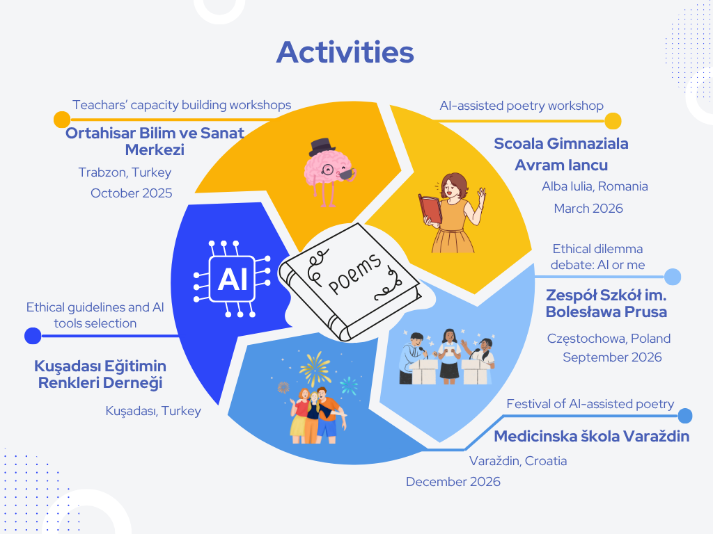 Globalni je cilj projekta ovladavanje kompetencijama samostalne, odgovorne, etične i informirane uporabe alata umjetne inteligencije učitelja i učenika razvojem smjernica i scenarija poučavanja kreativnog pisanja primjenjivih u različitim obrazovnim i kulturnim kontekstima.