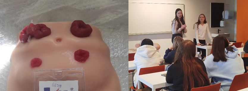 Tijekom ožujka bile smo na satovima razrednika učenika 2. i 3. razreda i educirale ih o različitim temama iz područja zdravstva. Tako smo na modelu ženskog torza objasnile važnost provođenja samopregleda dojke sa svrhom ranog otkrivanja raka dojke. Naglasile smo da je rak dojke najčešća zloćudna bolest kod žena, koja je izlječiva u više od 90 % slučajeva ako se otkrije na vrijeme. Navele smo i glavne simptome: pojavnost tvrde bezbolne kvržice, ekcematozna bradavica, iscjedak iz bradavice, koža dojke nalik na narančinu koru te promjene oblika ili veličine dojke. Ukazale smo učenicima na to da samopregled treba obavljati jednom mjesečno, svaki mjesec, najbolje između 5. i 7. dana ciklusa. Sam postupak izvođenja samopregleda demonstrirale smo na torzu te omogućile učenicima da također demonstriraju postupak. Također, naglasile smo da od raka dojke mnogo češće obolijevaju žene, no mogu oboljeti i muškarci.