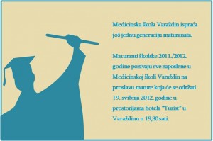 Maturanti školske 2011./2012. godine pozivaju sve zaposlene u Medicinskoj školi Varaždin na proslavu mature koja će se održati 19. svibnja 2012. godine u prostorijama hotela “Turist” u Varaždinu u 19,30 sati.