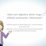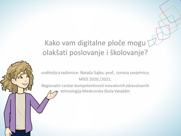 Tu je radionicu osmislila i vodila profesorica izvrsna savjetnica Nataša Sajko u virtualnoj sobi na Zoomu u 17 sati. Radionica je bila otvorena za javnost kao i učenike i djelatnike Medicinske škole. Cilj radionice bilo je podizanje razine digitalnih kompetencija. Zbog goleme količine raznolikih digitalnih alata, osobito aplikacija koje oponašaju digitalne bijele ploče, važno je upoznati se s njihovim funkcionalnostima da bi se što primjerenije koristile te tako ubrzalo i olakšalo i školovanje, ali i kasnije poslovanje i cjeloživotno učenje.