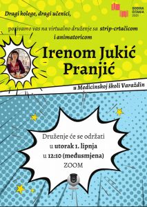 Susret je bio dogovoren preko aplikacije ZOOM jer ionako smo bili u online tjednu, a naša gošća je ljubazno prihvatila naš poziv da nam u dva školska sata u međusmjeni, u utorak, 1. lipnja, predstavi svoj umjetnički rad. Irena je višestruko nagrađivana animatorica sa svjetski poznatim nagradama, objavljivana strip-crtačica, profesorica, nastavnica, majka i sportašica. Živi i radi u Bjelovaru i Zagrebu.