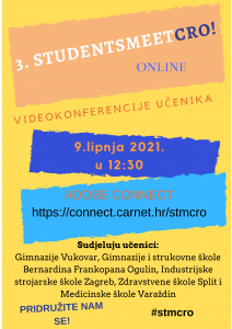 U srijedu 9. lipnja od 12,30 do 13,30 održan je 3. StudentmeetCRO! online. Riječ je videokonferenciji učenika na kojoj se smjenjuju kratke prezentacije u trajanju od pet minuta. Organizator smotre je Gimnazija i strukovna škola Bernardina Frankopana Ogulin, a voditeljica i inicijatorica smotre profesorica savjetnica Marijana Smolčec ujedno je moderatorica eTwinning grupe “Inclusive Education”.