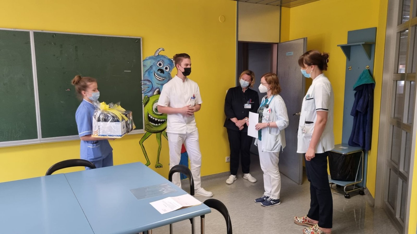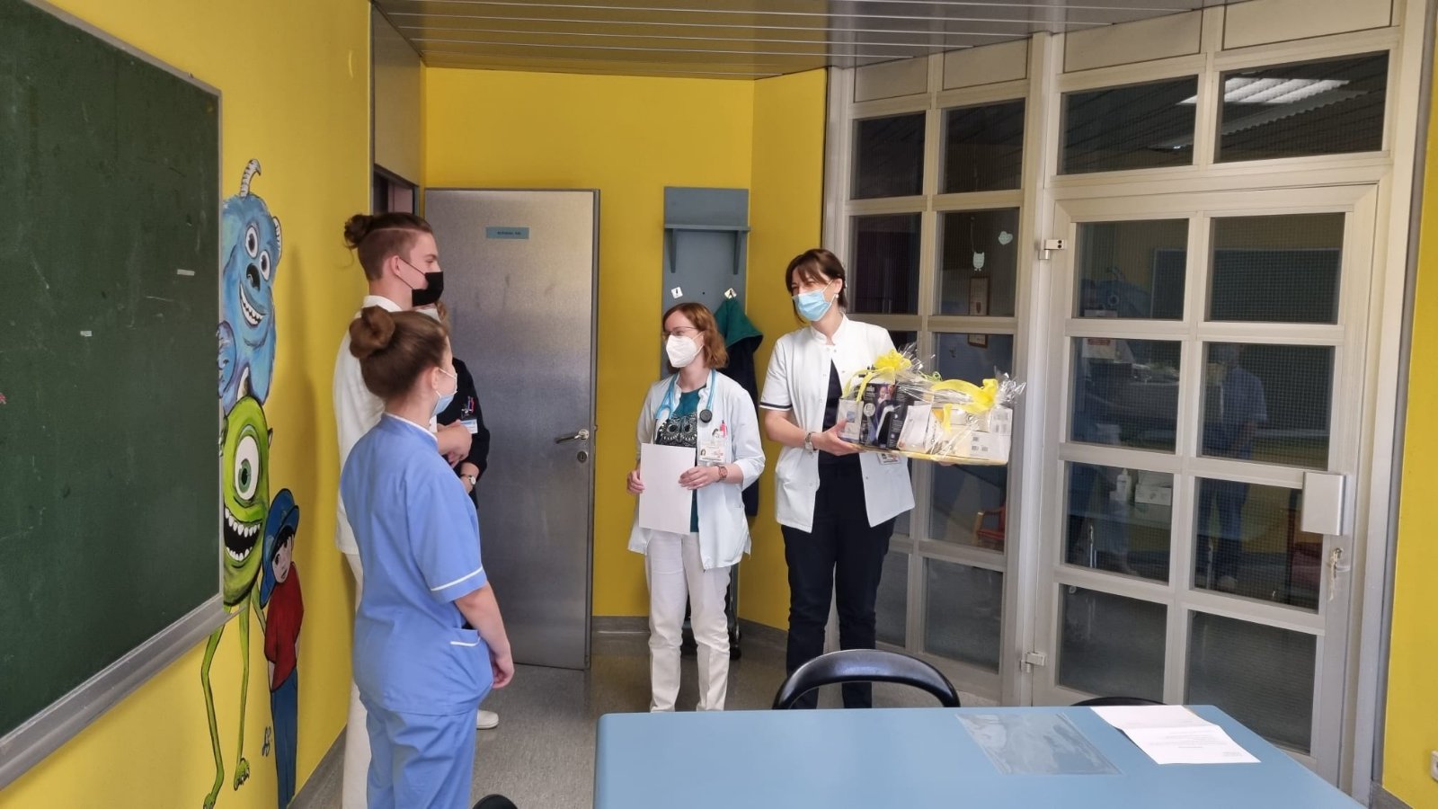 Uručenjem donacije u ponedjeljak 13. lipnja 2022. zaključena je humanitarna akcija naše škole. Dr. med. Ani Fluksek, supspecijalistici neuropedijatrije, i glavnoj sestri Odjela za pedijatriju Jasmini Kolarić, mag. med. techn., donaciju su uime svih učenika i nastavnika uručili učenici 4.a Veronika Poljak i Mihael Matulin, a donaciji su prisustvovali nastavnica Monika Kos Gašparić, mag. med. techn. i učenici 2. grupe 4. a razreda. Dr. Fluksek i magistra Kolarić zahvalile su na donaciji. Naglašeno je da su donirana pomagala vrlo korisna i često se koriste u liječenju i zdravstvenoj njezi bolesne djece te se i brzo troše.