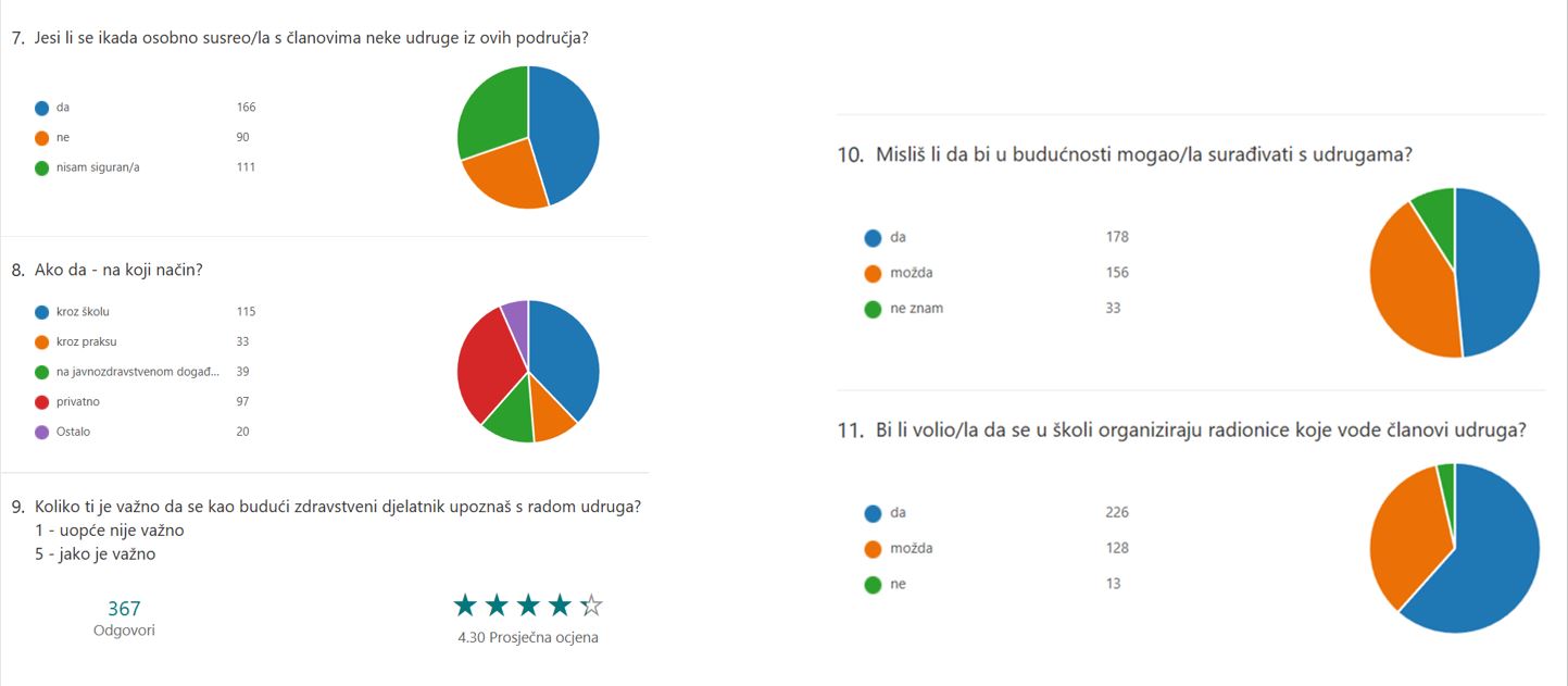 Učenici su istaknuli da se s radom udruga najčešće susreću tijekom školovanja ili javnih događanja, dok su osobni kontakti rjeđi. Unatoč tome, jasno su izrazili stav da je upoznavanje s djelovanjem udruga važno, osobito u kontekstu njihova budućeg obrazovanja i profesionalnog razvoja.