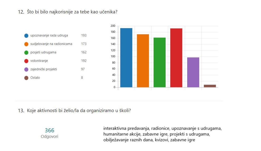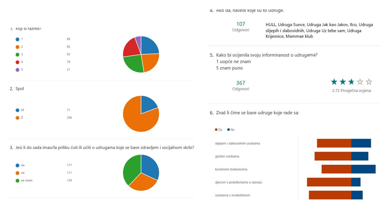 Rezultati ankete pokazali su da su mišljenja učenika često bila podijeljena, ali istovremeno i vrlo poticajna. Znatan dio učenika naveo je da je već čuo za brojne udruge, što nas je ugodno iznenadilo. Međutim, pokazalo se da velik broj učenika ne poznaje konkretne aktivnosti udruga ni način na koji one djeluju u svakodnevnoj praksi, što upućuje na nepodudarnost između prepoznatljivosti naziva udruga i stvarnog razumijevanja njihova rada.